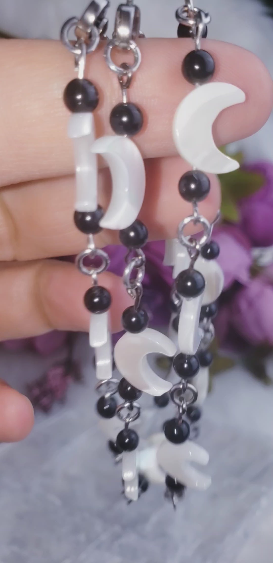 These bracelets feature 7 meticulously carved seashell moon crescents that shimmer as they move.