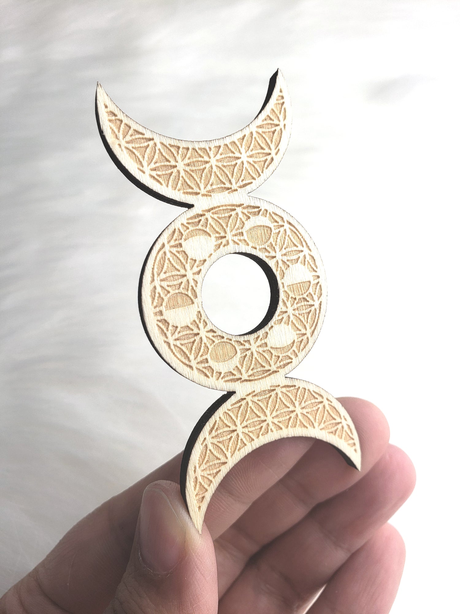 If you look closely at this design you'll notice the intricate flower of life sacred geometric pattern all over and the moon phase circling the middle moon.