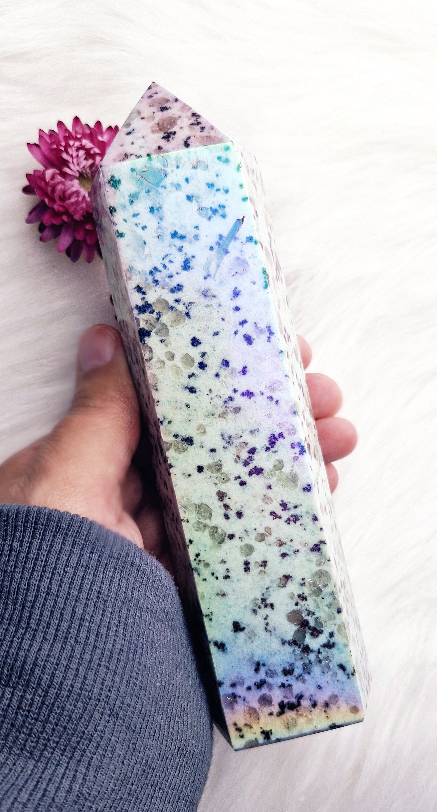 Big beautiful Aura Kiwi Jasper tower with rainbow metallic sheen ✨️ Shes a mood regulator and a barrier breaker!