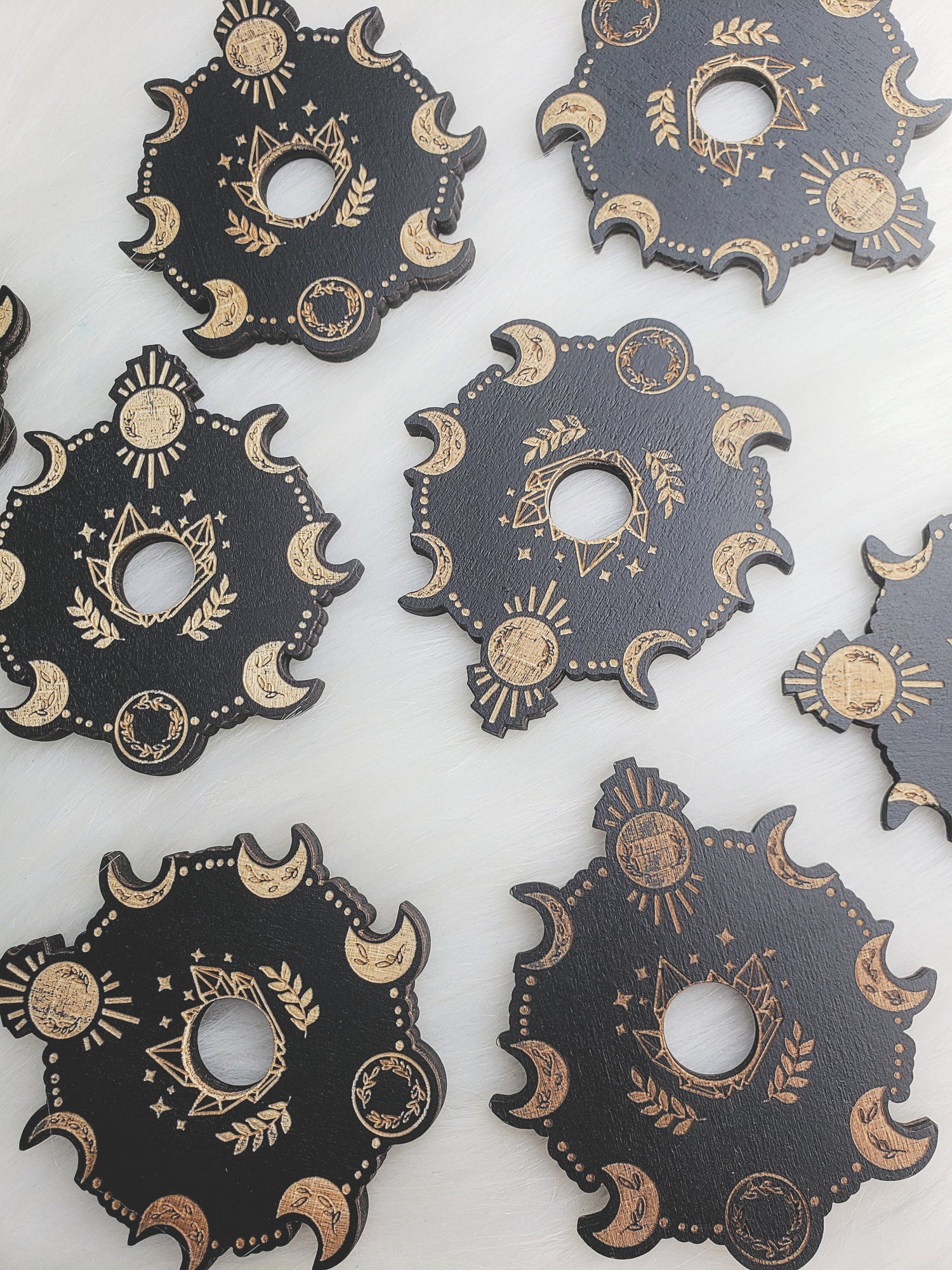 Machine cut from mdf and laser engraved with all sorts of celestial goodness including the full moon phase around the outside and a crystal cluster in the middle.