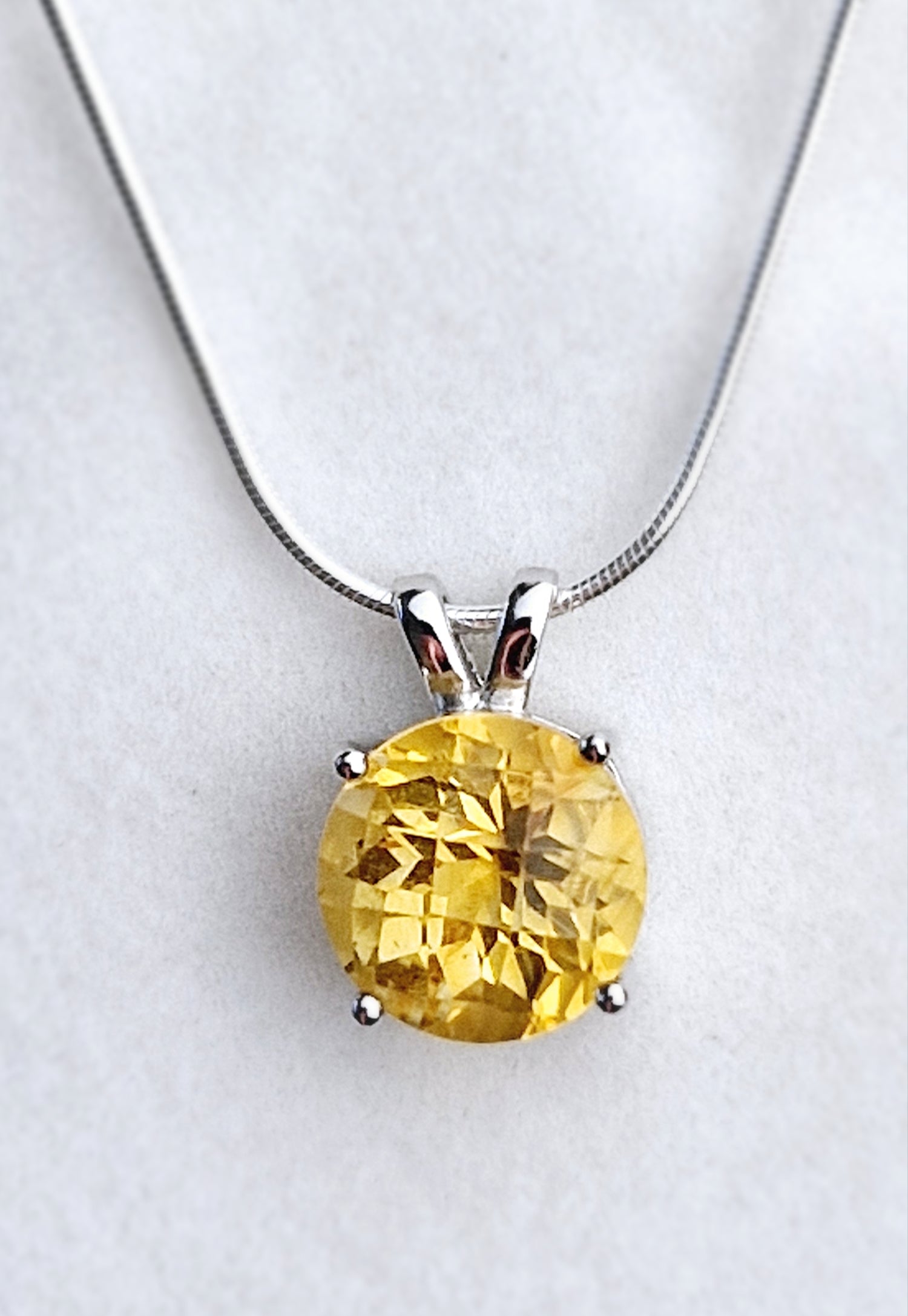 Beautifully faceted Genuine Earth Mined Citrine set in a solid Sterling Silver claw setting and hung on a solid Sterling Silver snake Chain.