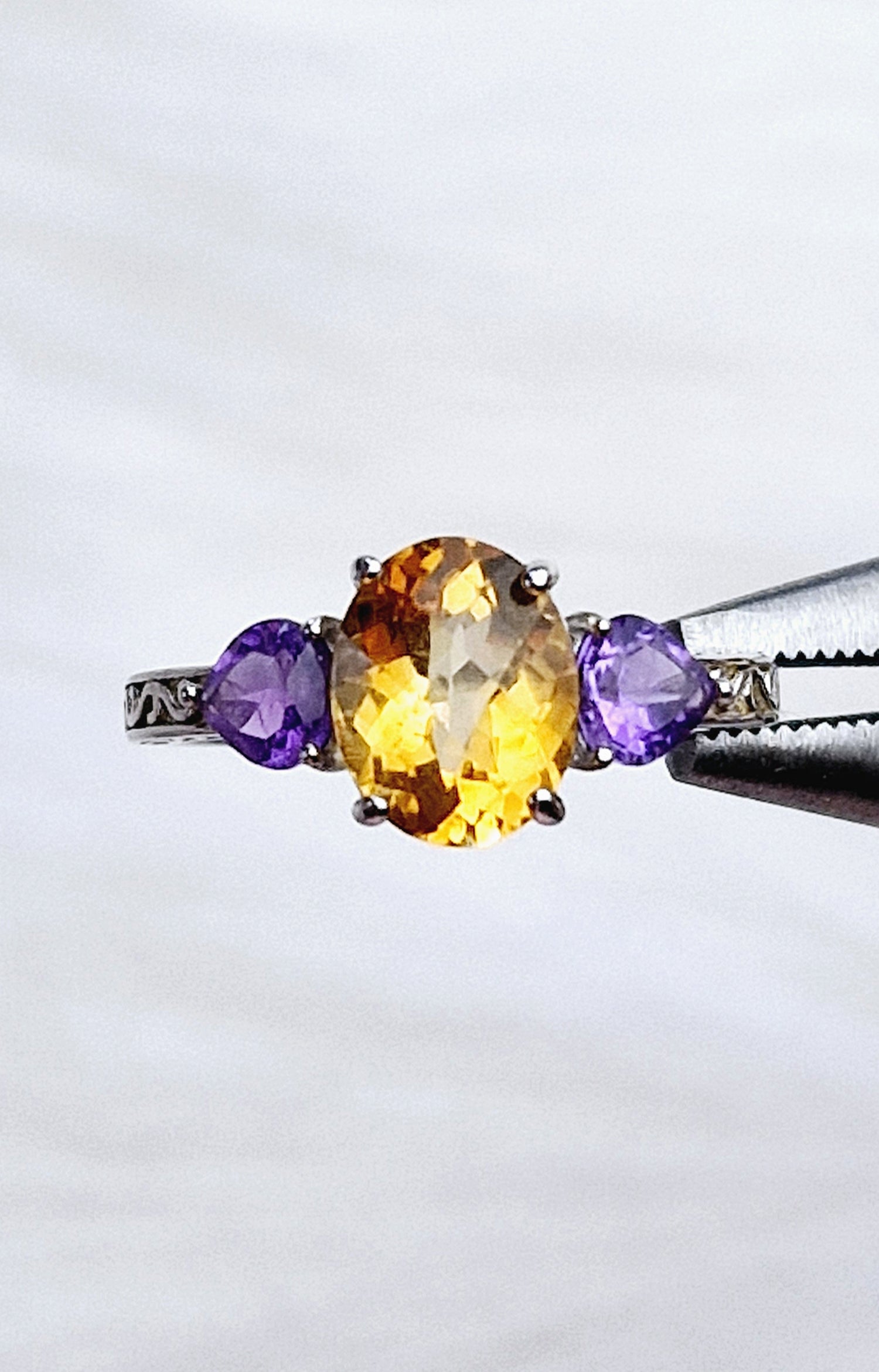 Each ring features a faceted Citrine centre stone with 2 Amethyst accent stones either side set in solid Sterling Silver. All precious gems are genuine, Earth mined crystals (Brazillian Citrine & African Amethyst)